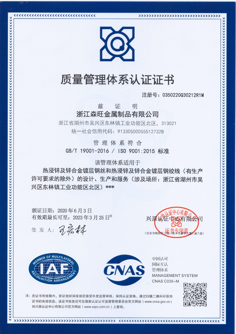 浙江森旺金屬制品有限公司成立于2012年,坐落湖州市吳興區東林鎮工業功能區。公司專業從事各類鍍鋅鋼絲、鋼絞線等產品的開發及生產。目前產品已廣泛應用于各類通信光電纜,電力輸送,電氣化鐵路工程,各類堤壩防護及農業溫室等工程領域。公司秉承“追求卓越品質,創建卓著信譽”的經營理念,始終堅持專業化、規模化的經營模式。